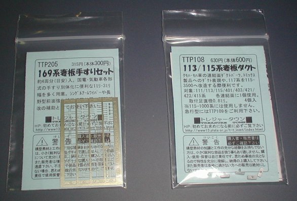 各車種妻板の手すりを別パーツ化しているため、トレジャータウンのTTP205:169系妻板手すりセットを主に使用しています。このパーツからは
