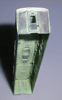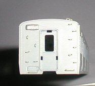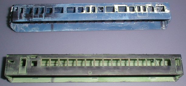 で埋めていますが、作業性のためでポリパテでも何でも良いと思います。妻部のモールドのうち手すりは別パーツ化するために車体と屋根を接着する